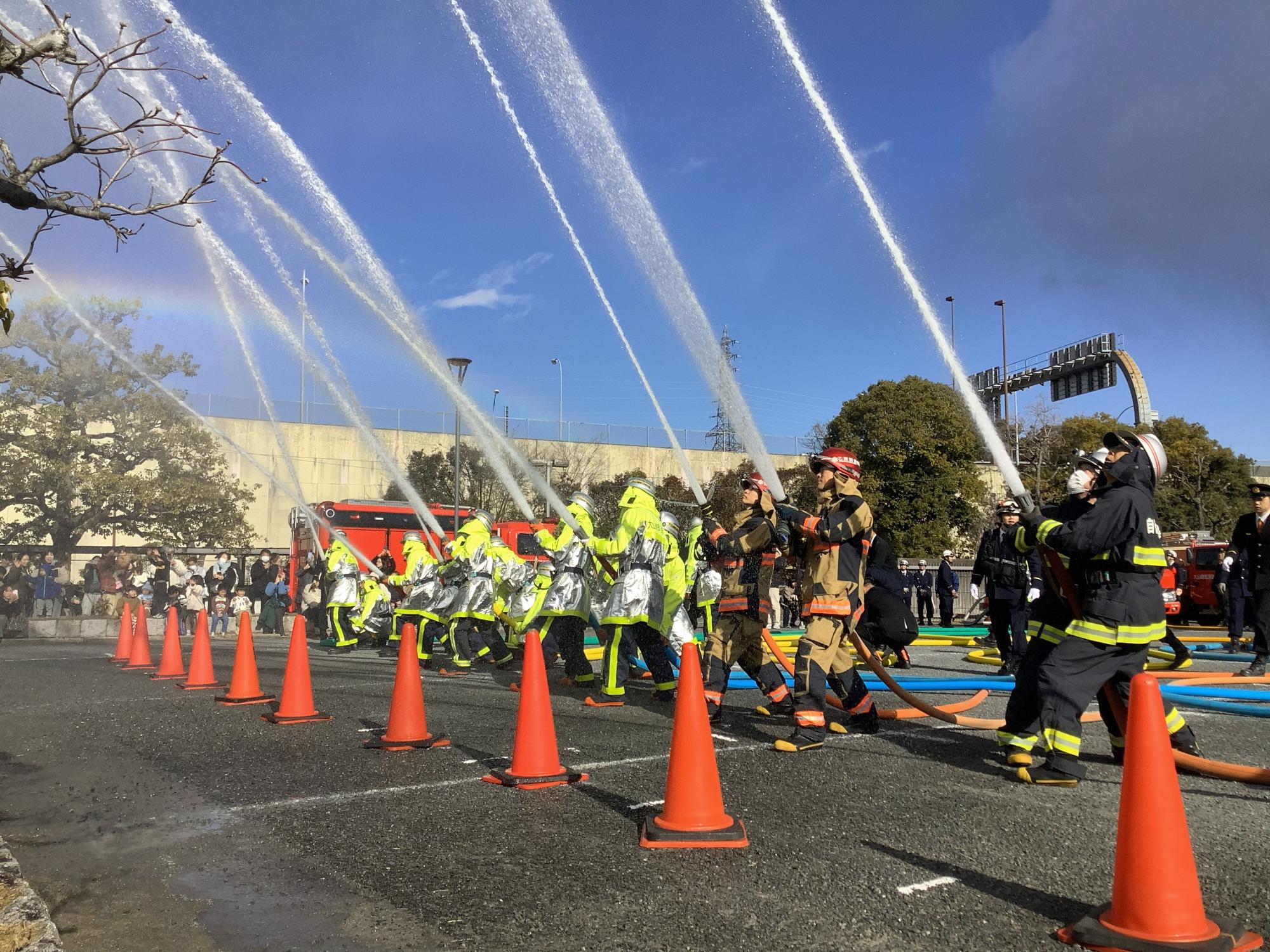 屋内の部の式典に引き続き、屋外の部を体育館駐車場で行いました。今回は消防部隊観閲と一斉放水を実施し、お寒い中ご来場いただきました皆様に披露させていただきました。