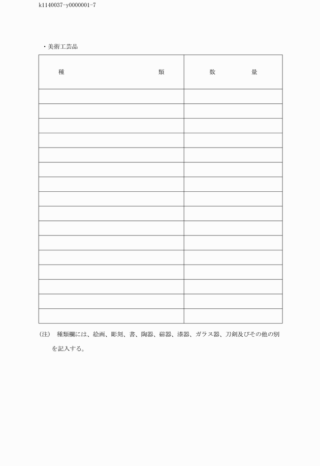 5 条例第2条第1項第6号の美術工芸品の種類は、絵画、彫刻、書、陶器、磁器、漆器、ガラス器、刀剣及びその他とする。