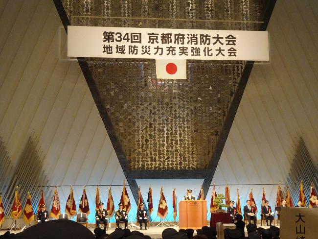 京都府消防大会は、京都府と京都府消防協会の主催によって、消防関係者が一堂に会し、自治体消防の伝統と崇高な消防精神を受け継ぎ、安心と安全の京都の実現に向け地域における消防防災のリーダーとしての自覚を高め、府民の信頼に答えることを趣旨として、隔年で開催されている大会です。